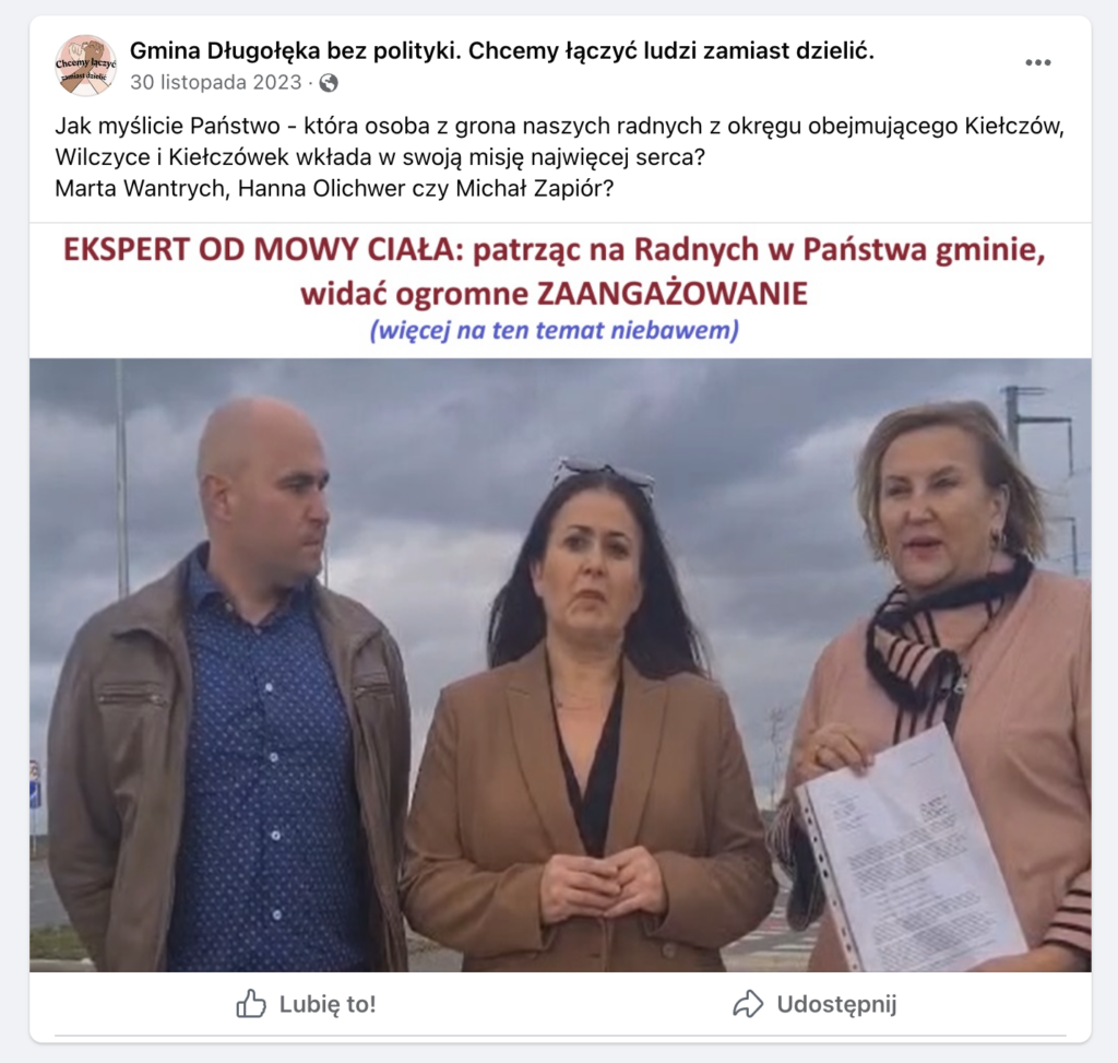 zrzut z portalu Facebook Część z tych postów i profili zniknęła z przestrzeni publicznej, innym zostały zmienione nazwy, ale nadal wiele z nich jest dostępnych. Pozbawione zostały „najciekawszych” materiałów, np. zestawiających osobę Wójta z 800+. Nadal pod wieloma postami znajdziemy jednak reakcje i udostępnienia autorstwa Radnych klubu „Bliżej Ludzi” – Michała Zapióra, Marty Wantrych, czy Hanny Olichwer.