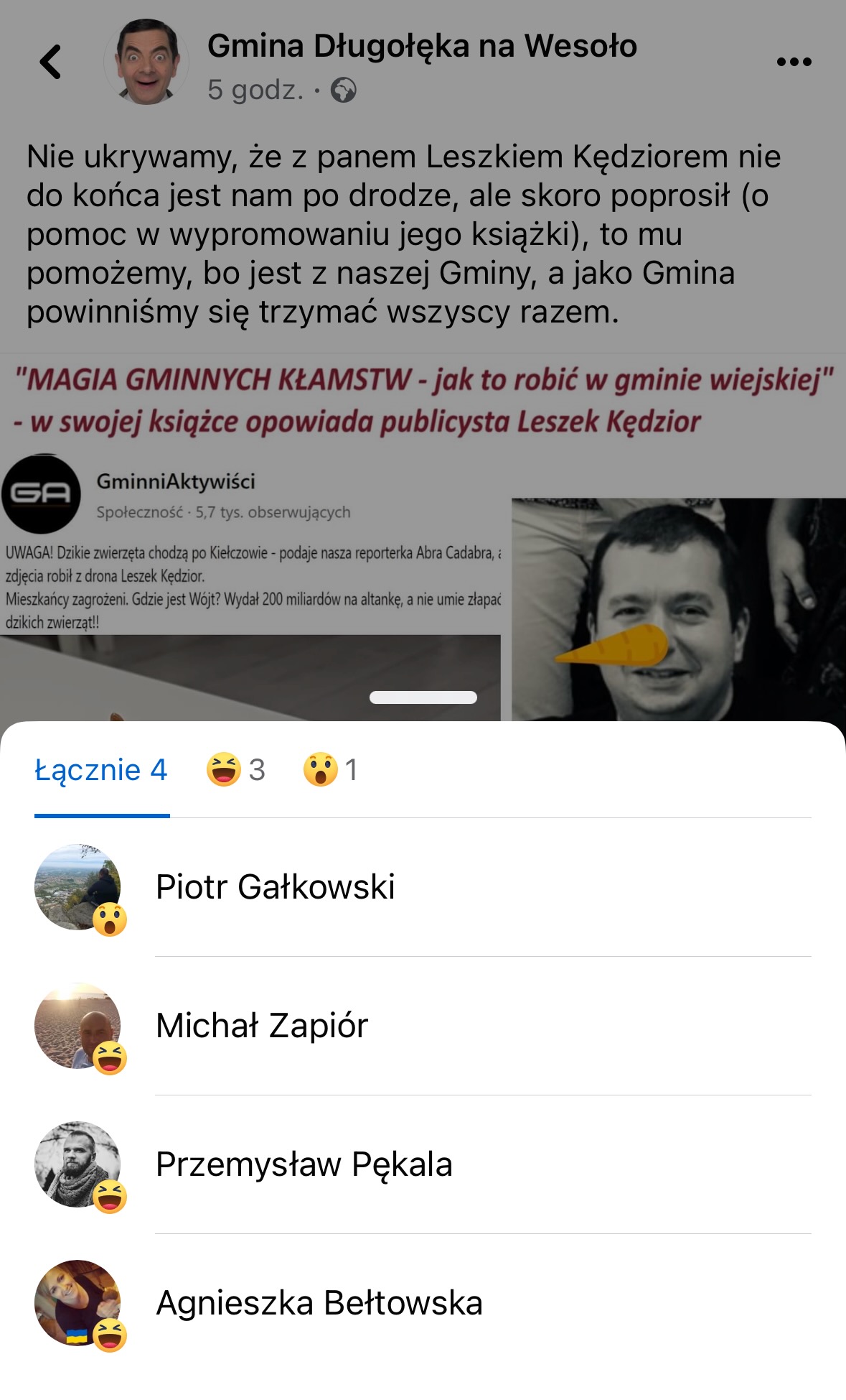 zrzut z portalu Facebook Część z tych postów i profili zniknęła z przestrzeni publicznej, innym zostały zmienione nazwy, ale nadal wiele z nich jest dostępnych. Pozbawione zostały „najciekawszych” materiałów, np. zestawiających osobę Wójta z 800+. Nadal pod wieloma postami znajdziemy jednak reakcje i udostępnienia autorstwa Radnych klubu „Bliżej Ludzi” – Michała Zapióra, Marty Wantrych, czy Hanny Olichwer.